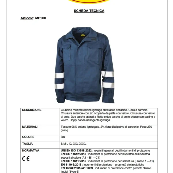Logica MP200 Giubbino Multiprotezione Pentavalente Ignifugo Antistatico Antiacido. 98% Cotone 2% Fibra Di Carbonio