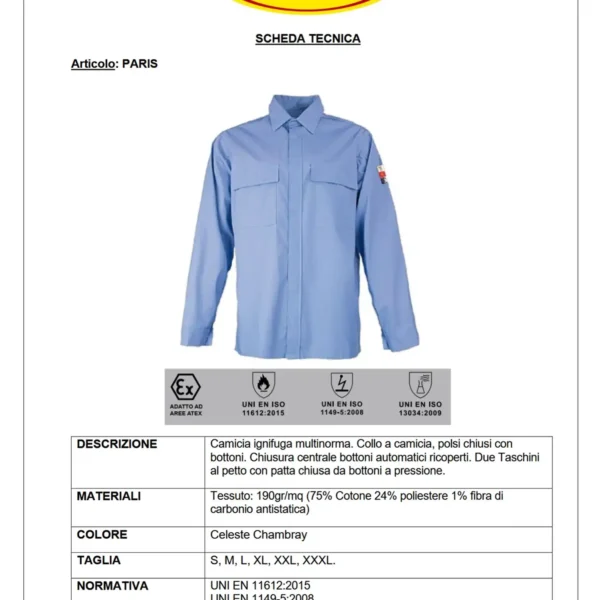 Logica Paris Camicia ignifuga Multiprotezione Trivalente Collo A Camicia, Polsi Chiusi Con Bottoni.