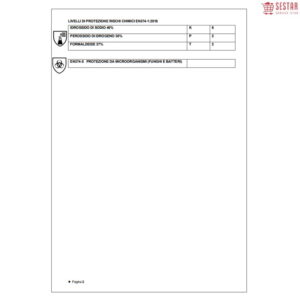 | Normativa | CE DPI III° categoria EN420:2003+A1:2009 Destrezza Livello 5 EN374-1:2016 Tipo C (protezione rischi chimici) KM EN374-5:2016 (protezione da microorganismi tipo funghi e batteri) |
