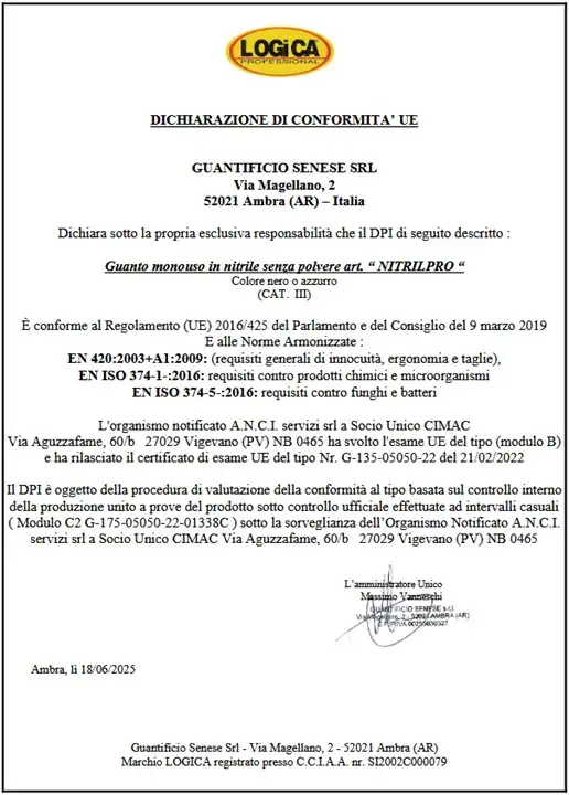 - EN374-1:2016 (protezione chimica) Tipo B