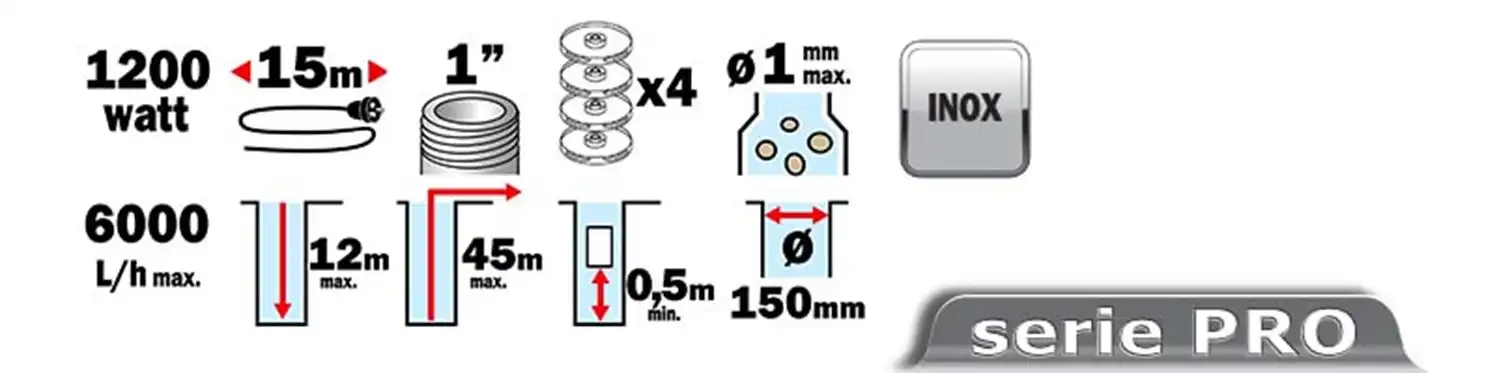 - Profondità d’immersione max. 12 m. Prevalenza: 45 m.
